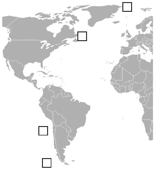 55.1. U kojem dijelu svijeta žive prikazane vrste pingvina A. i B.? Upišite slova na karti svijeta u dvama od ponuđenih četiriju kvadratića.