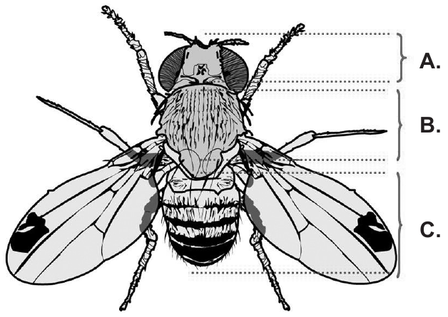 47.1. Kako se nazivaju tri osnovna dijela tijela kukca koji su na slici označeni slovima A., B. i C.?