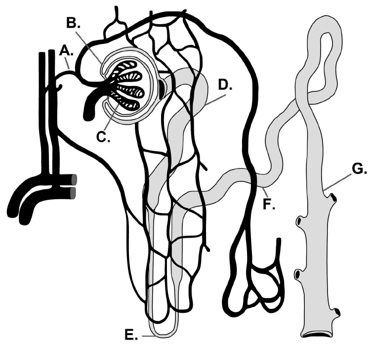 50.2. Kako se naziva i kojim je slovom označen na slici barem jedan dio nefrona u kojem se reapsorbira voda?