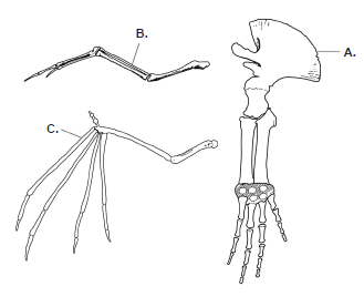 54.1. Kojim su slovima na slici označene kosti prednjih udova ptice, šišmiša i kita?