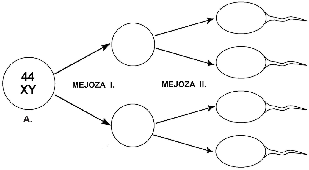 51.1. U sve prazne krugove na slici upišite odgovarajući broj autosoma i spolne kromosome na način kako je to upisano za stanicu (krug) označen slovom A.