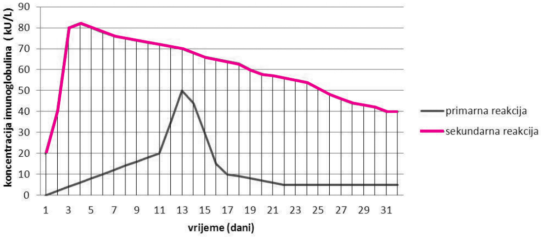 Slika prikazuje promjenu koncentracije imunoglobulina u krvi dviju sestara tijekom 31 dana, kod jedne sestre u primarnoj, a kod druge sestre u sekundarnoj imunološkoj reakciji. Sestre su bile u doticaju s uzročnikom rubeole.