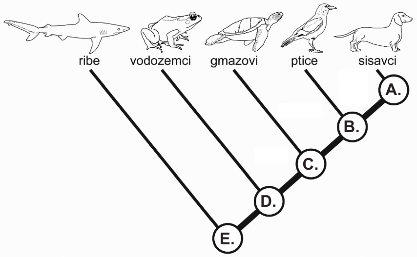 53.1. Slovima A., B., C., D. i E. označene su značajke pojedine skupine kralježnjaka koje su posljedica njihova evolucijskoga razvoja.Kojima su slovima označene sljedeće dvije značajke? Značajka „prvi kralježnjaci koji dišu plućima" označena je slovom . Značajka „prva pojava amnionskih ovojnica jajeta" označena je slovom .