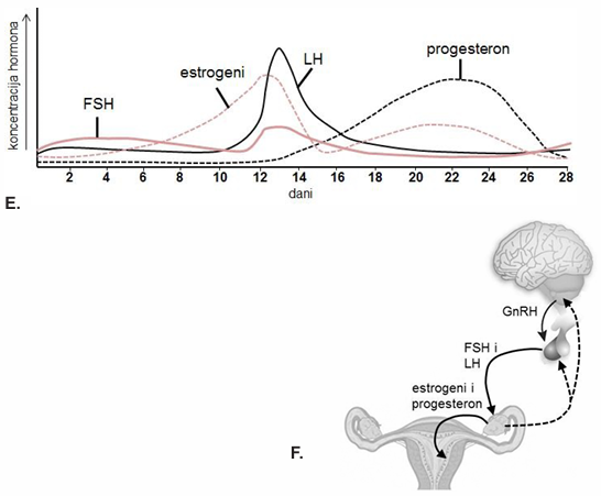35. Slika E. prikazuje promjene koncentracija hormona tijekom menstruacijskoga ciklusa, a slika F. mehanizam njihova izlučivanja. Tijekom prikazanoga ciklusa nije došlo do oplodnje, a ovulacija se dogodila 14. dana.