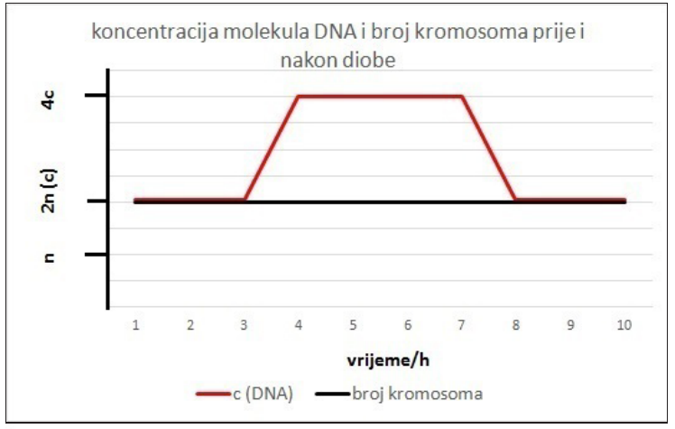 54. Slika prikazuje rezultate pokusa kojim su određene koncentracije molekula DNA i broj kromosoma prije i nakon diobe u određenome tipu stanica.