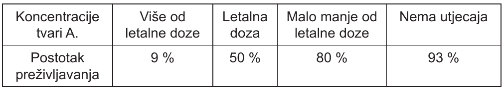 54.2. Student veterinarskoga fakulteta prijavljuje projekt kojim želi istražiti ima li tvar A. mutageni učinak na stanice životinjske kože. Pratio je promjene kože laboratorijskih miševa. Tablica prikazuje koncentracije tvari A. korištene u pokusu i postotak preživljavanja.