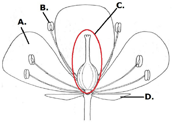 61.2. Navedite jednu ulogu tvorbe označene na slici slovom C. u životnome ciklusu biljke kritosjemenjače.