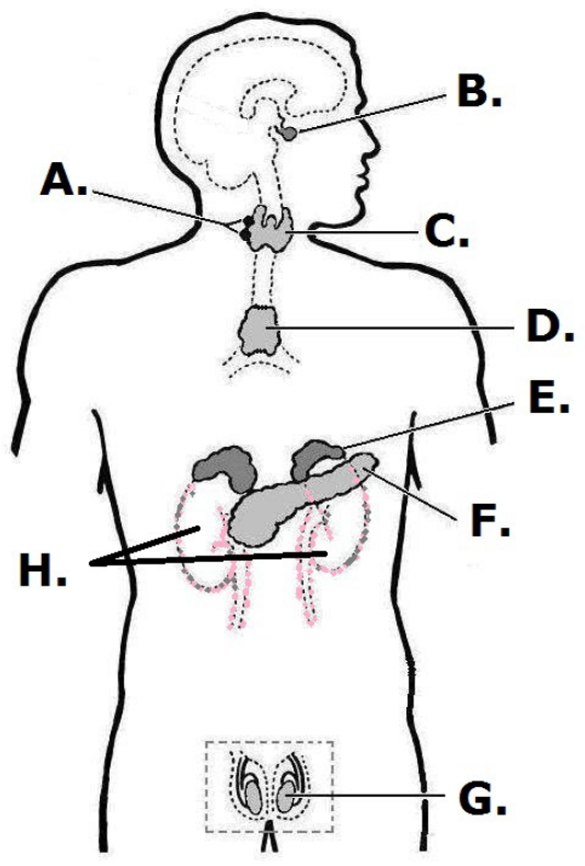 66.1. Koja žlijezda luči antidiuretski hormon (ADH) i kojim je slovom označena na slici?