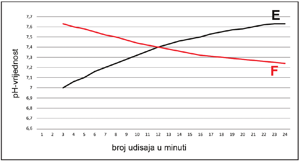A. krivulja E jer se koncentracija $\mathrm{H}^{+}$iona povećava s povećanjem broja udisaja