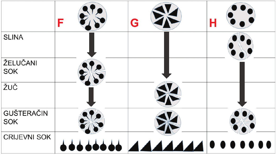 34. Na slici je prikazana razgradnja hranjivih tvari u probavnome sustavu. Slovima F, G i H označene su različite vrste makromolekula koje se djelovanjem probavnih enzima postupno razgrađuju na jednostavnije spojeve.