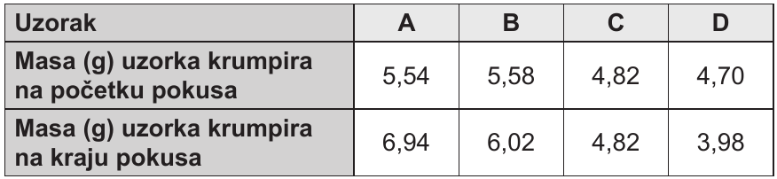 54. Izrezane su jednake kockice krumpira i potom su izvagane. Zatim su stavljene u vodene otopine šećera različitih koncentracija i nakon 24 sata ponovno su izvagane. U tablici su navedeni rezultati mjerenja.