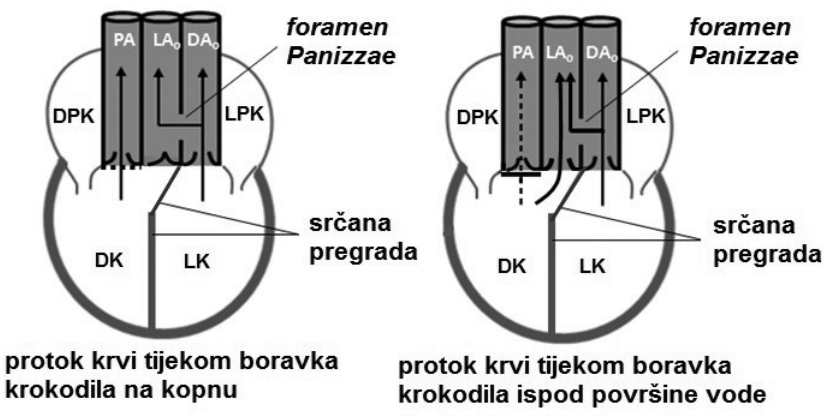 61. Na slici su prikazane prilagodbe u građi srčano-žilnoga sustava krokodila. Srce krokodila ima dva aortina luka, lijevi (LA $)$ i desni ( $D A_{o}$ ), a između njih je zalistak foramen Panizzae. Takva građa omogućuje preusmjeravanje krvi iz maloga (plućnoga) optoka krvi u veliki (sistemski) optok krvi aktivnim zatvaranjem zaliska na izlazu iz srca u plućnu arteriju (PA).