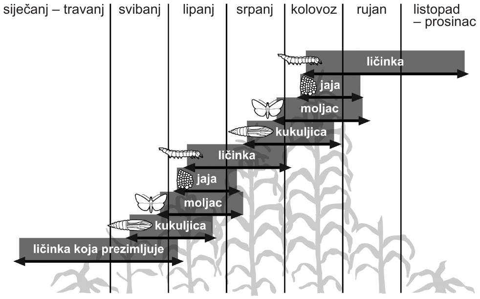 63. Na slici su prikazani razvojni stadiji životnoga ciklusa kukuruznoga moljca kroz godinu.