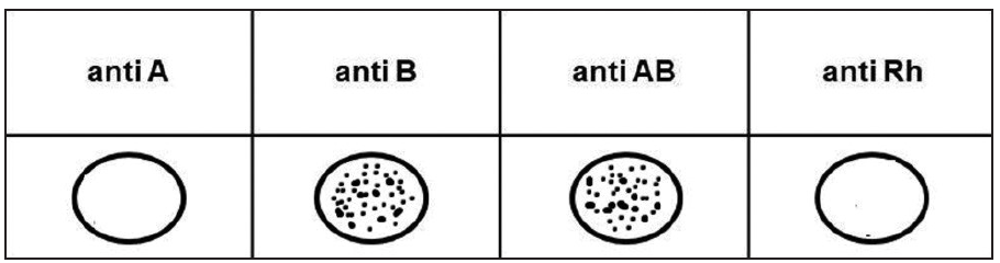 13. Pozorno promotrite sliku koja prikazuje rezultate aglutinacije pri određivanju krvne grupe i Rh faktora. Točkice prikazuju aglutinaciju u kapljici krvi.