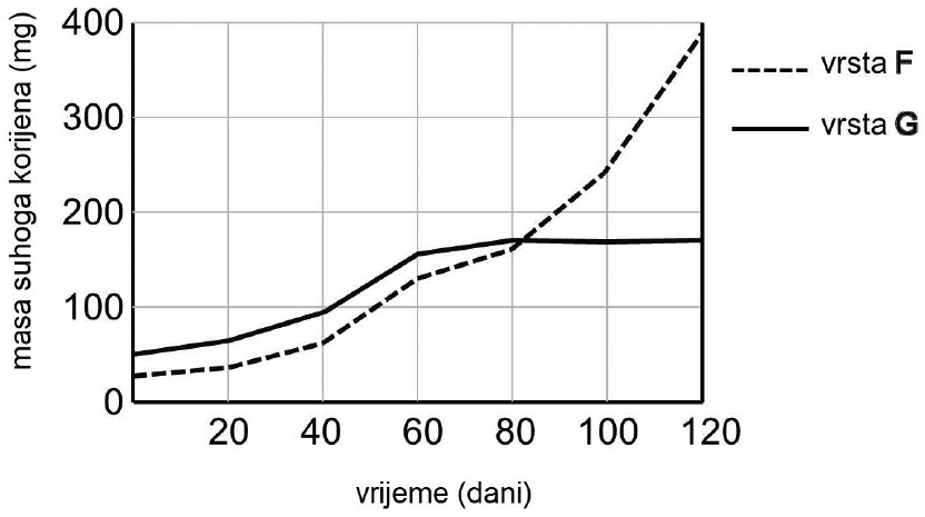 Svakih 20 dana vadili su iz tla jednaki broj biljaka obiju vrsta, odrezali im korijenje, uklonili s njega čestice tla te osušili, izvagali i izračunali prosječnu masu suhoga korijena jedinka obiju biljnih vrsta. Mjerenje su provodili 120 dana, a rezultati mjerenja prikazani su na slici.