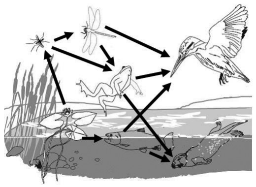 44. Pozorno promotrite sliku koja prikazuje hranidbenu mrežu jednoga izoliranog ekosustava. Strelice su usmjerene prema nadređenomu članu hranidbene mreže.