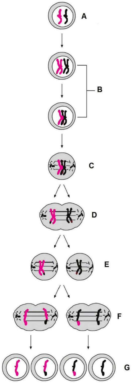 55.1. Navedite naziv faze u kojoj se razmjenjuju aleli homolognih kromosoma.Kojim je slovom ta faza označena na slici?