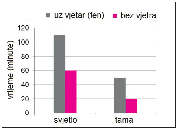 56. Učenici su napravili pokus ovisnosti transpiracije o vanjskim čimbenicima. Mjerili su volumen izlučene vode tijekom jednoga sata. Ostali uvjeti (temperatura, vlažnost i sastav zraka) u kojima je proveden pokus bili su stalni. Na slici je prikazan intenzitet transpiracije ovisan o svjetlosti i strujanju zraka (vjetru).