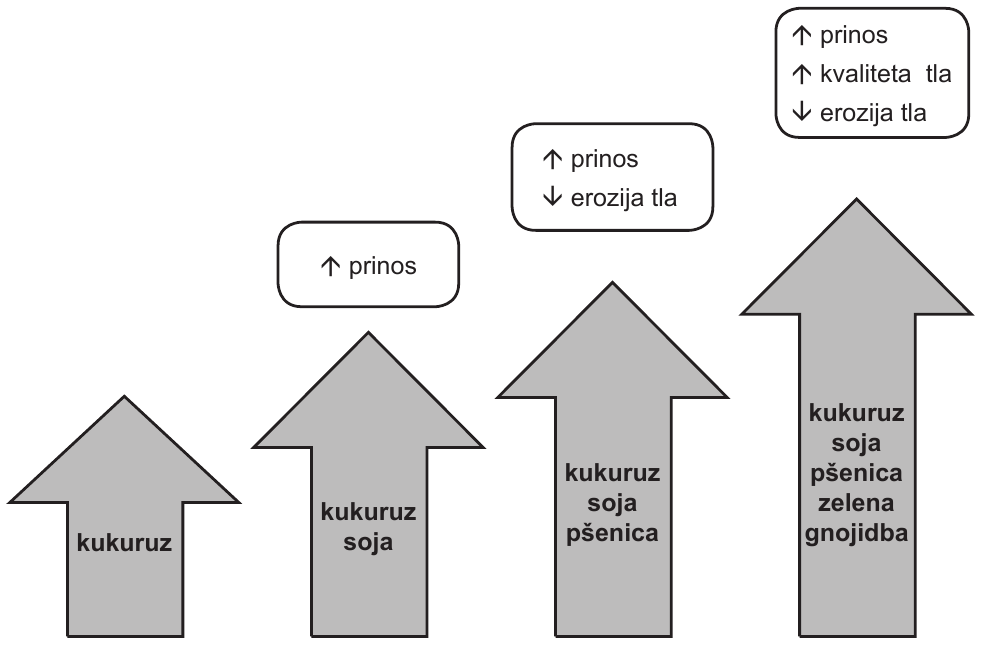 57. Plodored je način iskorištavanja poljoprivrednih površina pri kojemu se tijekom godina izmjenjuju poljoprivredne kulture na istoj oranici, npr. kukuruz - soja pšenica. Na slici su prikazani učinci uvođenja različitih poljoprivrednih kultura u plodored i njihove izmjene.