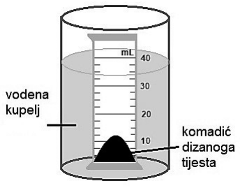 60. Proveden je pokus radi određivanja brzine disanja živih stanica pekarskoga kvasca u izrađenome tijestu kruha pri različitim temperaturama. Jednaka masa tijesta smještena je na dno svakoga od pet plastičnih cilindara. Svaki je cilindar zasebno stavljen u vodenu kupelj da bi se održala određena temperatura. Volumen dizanoga tijesta u svakome cilindru određen je nakon 15 minuta.