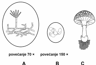 62. Pozorno promotrite slike koje prikazuju tri vrste gljiva. Gljive prikazane na slikama A i B promatrane su mikroskopom.