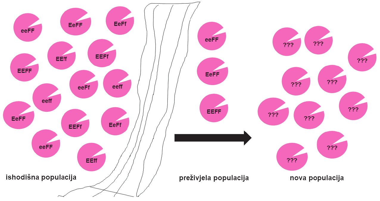 Pozorno promotrite sliku na kojoj je prikazana populacija organizama neke vrsteprije i poslije prirodne katastrofe koja je nepovratno odvojila dio jedinka.