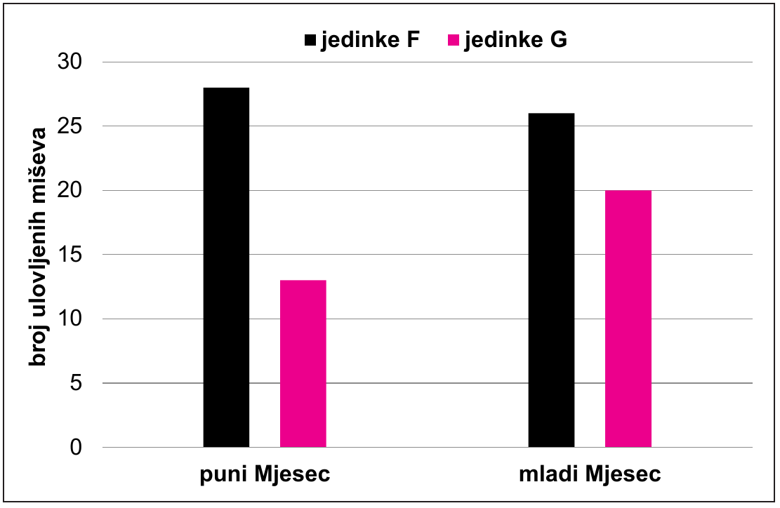 30. Provedeno je istraživanje utjecaja različitih boja krzna jedinka miševa \(\mathbf{F i} \mathbf{G}\) iste vrste na mogućnost preživljavanja. Isti broj miševa različitih boja krzna pušten je tijekom noći u ograđeno područje tamnoga tla u kojemu su se nalazile sove. Pozorno promotrite sliku na kojoj je prikazan broj miševa ulovljenih ovisno o fazi Mjeseca.