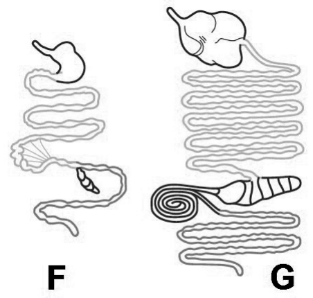 A. Vrsta F prilagođena je biljnoj ishrani jer ima dulje tanko crijevo od vrste $\mathbf{G}$.
