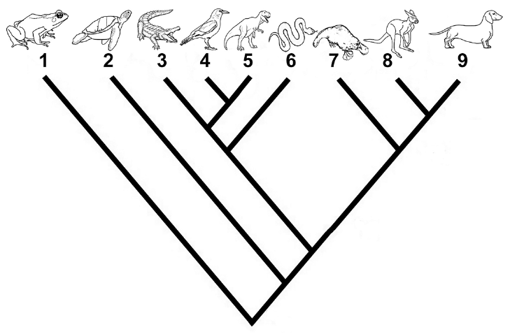 47. Pozorno promotrite sliku na kojoj su prikazani mogući srodnički odnosi unutar sistematske kategorije (taksona) kralježnjaka.