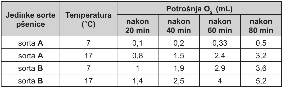 52.2. Napišite izraz (formulu) za izračun prosječne potrošnje kisika po minuti za sortu pšenice A na 17 °C tijekom prvih 40 minuta koristeći se podatcima iz tablice.