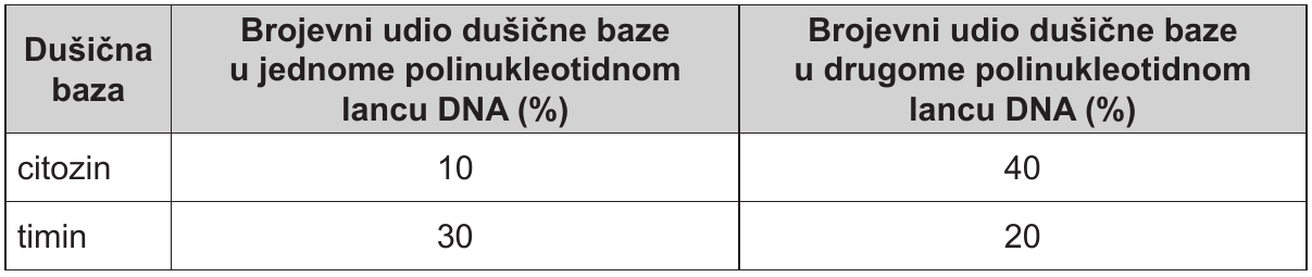 Pozorno promotrite tablicu u kojoj su navedeni brojevni udjeli dušičnih baza citozina i timina u komplementarnima polinukleotidnim lancima molekule DNA.