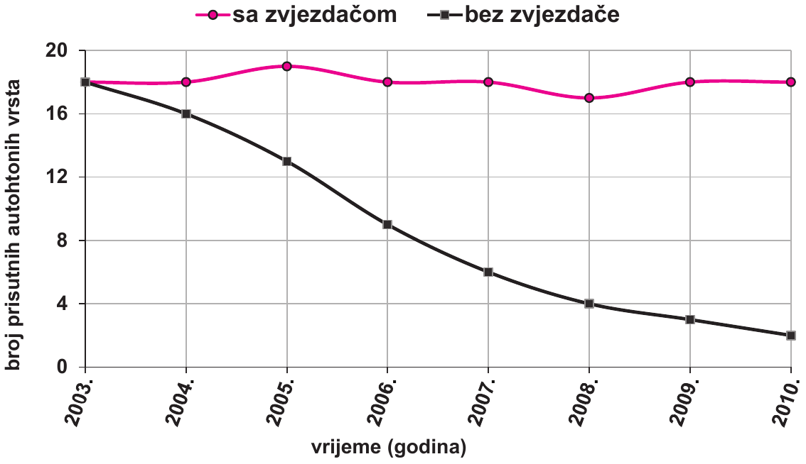 Provedeno je istraživanje utjecaja ljubičaste morske zvjezdače na raznolikost vrsta morskoga ekosustava u kojemu je uočen nagli porast brojnosti invazivne vrste dagnji. Istražena su dva lokaliteta: na jednome je bila prisutna zvjezdača, a na drugome nije. Pozorno promotrite sliku koja prikazuje rezultate istraživanja.