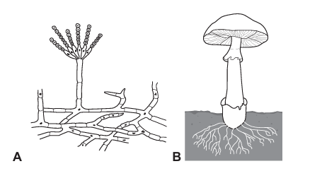 Pozorno promotrite sliku koja prikazuje pojednostavljenu građu zelene plijesni (kistac) i gljive lističarke.