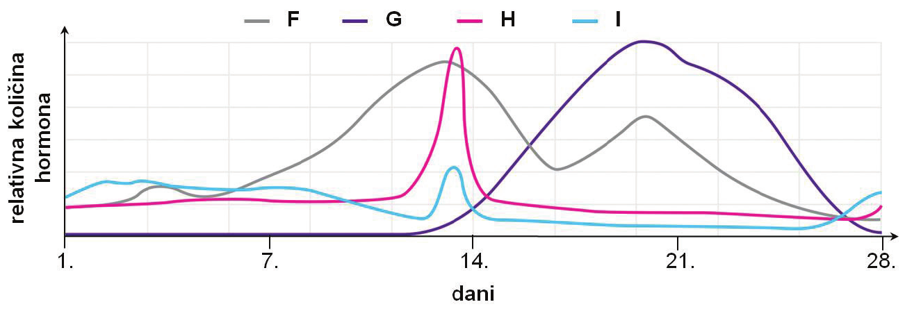 Pozorno promotrite sliku koja prikazuje promjene u koncentraciji hormona označenih slovima od $\mathbf{F}$ do $\mathbf{I}$ na slici tijekom menstruacijskoga ciklusa žena.