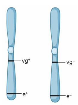 Pozorno promotrite sliku koja prikazuje raspored alela za duljinu krila (vg) i boju tijela (e) na kromosomima vinske mušice prije mejoze. Aleli se nasljeđuju vezano, a tijekom mejoze nije se dogodila kromatidna izmjena.