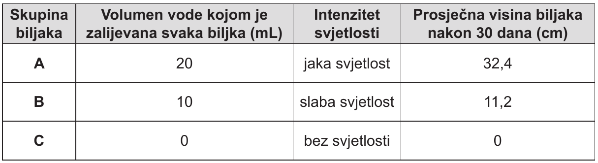 Skupina biljakaVolumen vode kojom je zalijevana svaka biljka (mL)Intenzitet svjetlostiProsječna visina biljaka nakon 30 dana (cm)