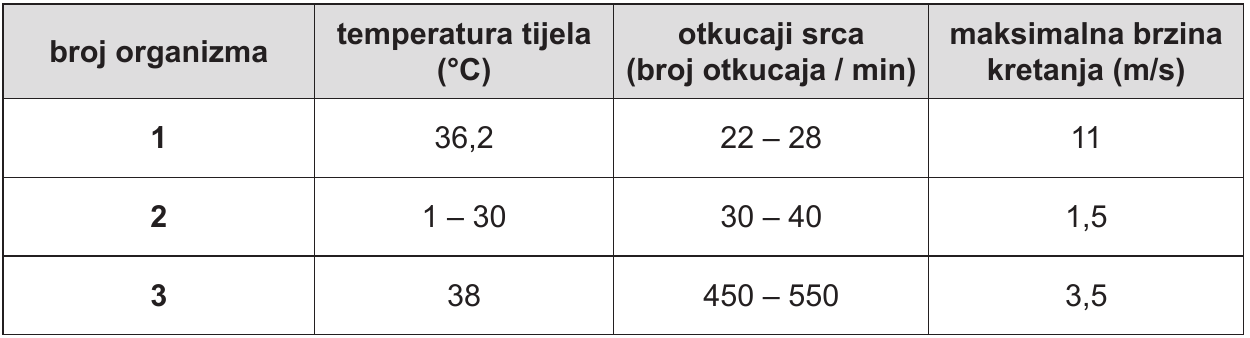 Pozorno promotrite tablicu u kojoj su prikazani neki fiziološki parametri triju vrsta kralježnjaka slona, miša i šarana koji su nasumično označeni brojevima 1, 2 i 3 u prvome stupcu tablice.