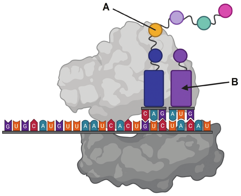 46.3. Koji slijed nukleotida u mRNA određuje molekulu označenu slovom A? U odgovoru označite 5' i 3' krajeve slijeda nukleotida.