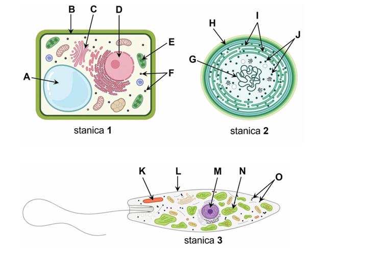 Pozorno promotrite slike koje prikazuju stanice različitih organizama označenih brojevima 1, 2 i 3. Određeni dijelovi stanica označeni su slovima od A do O na slici. Stanica označena brojem 1 stanica je višestaničnoga organizma.
