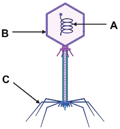 Pozorno promotrite sliku koja prikazuje građu jednoga tipa virusa na kojoj su neki dijelovi virusa označeni slovima od A do C.