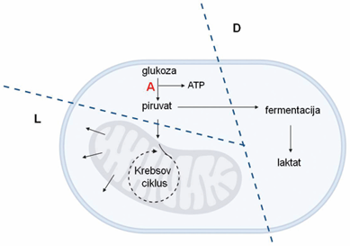 53. Pozorno promotrite sliku koja prikazuje usporedbu anaerobnoga i aerobnoga metabolizma u stanici. Isprekidanom crtom odvojeni su navedeni procesi i označeni slovima L i D.