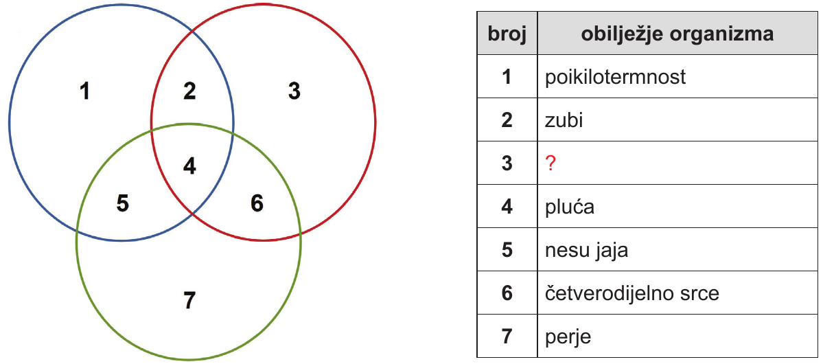Pozorno promotrite sliku koja prikazuje usporedbu obilježja ptice, majmuna i guštera. Brojevima su u Vennovu dijagramu označena obilježja organizama koja su navedena u tablici. Obilježje označeno brojem 3 nedostaje.