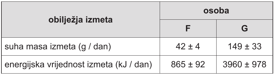 38. Pozorno promotrite tablicu koja uspoređuje obilježja izmeta dviju osoba jednakih duljina tankoga crijeva, a označenih slovima F i G. Jedna je osoba zdravoga probavila, a drugoj je uslijed bolesti promijenjena funkcionalnost tankoga crijeva.