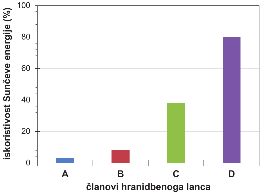 Pozorno promotrite sliku koja prikazuje iskoristivost Sunčeve energije pojedinih članovahranjidbenoga lanca morskoga ekosustava. Hranidbeni lanac čine četiri člana (sipa, posidonija, puž zekan, morski pas) i označeni su slovima od 𝐀 do 𝐃 na slici.