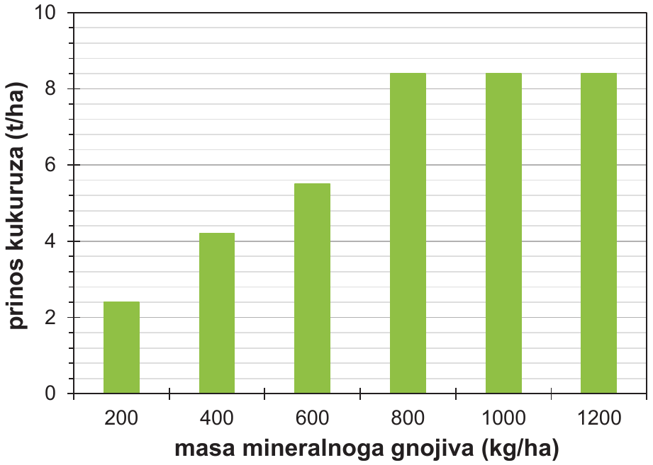 Provedeno je istraživanje na šest poljoprivrednih parcela podjednakoga kemijskog sastava i mikroklimatskih uvjeta. Na svakoj parceli zasijana je ista sorta kukuruza i tijekom godine nanesena je određena masa mineralnoga gnojiva. Pozorno promotrite sliku koja prikazuje ovisnost prinosa kukuruza (t/ha) o masi mineralnoga gnojiva (kg/ha) tijekom jedne godine.