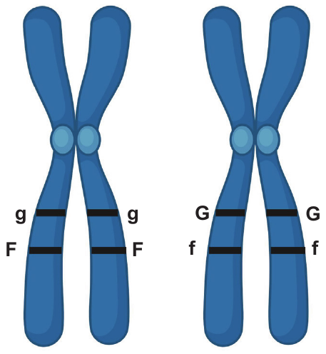 53. Gubitak sluha u osoba oboljelih od Pendredova sindroma određen je alelom g, a normalan sluh alelom G. Oštećenje pluća uslijed cistične fibroze određeno je alelom f, a razvoj zdravih pluća alelom F.