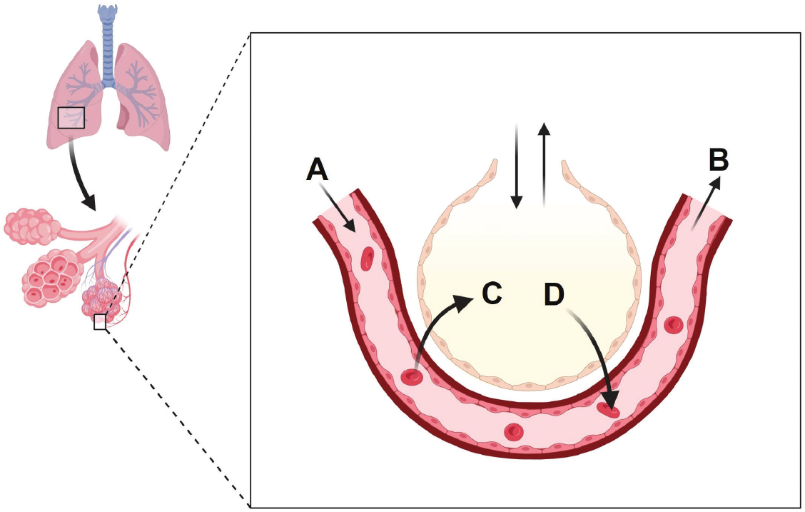 Pozorno promotrite sliku koja prikazuje izmjene plinova, označenih slovima C i D, između alveole i kapilare. Smjer kretanja krvi označen je strelicama i slovima A i B.