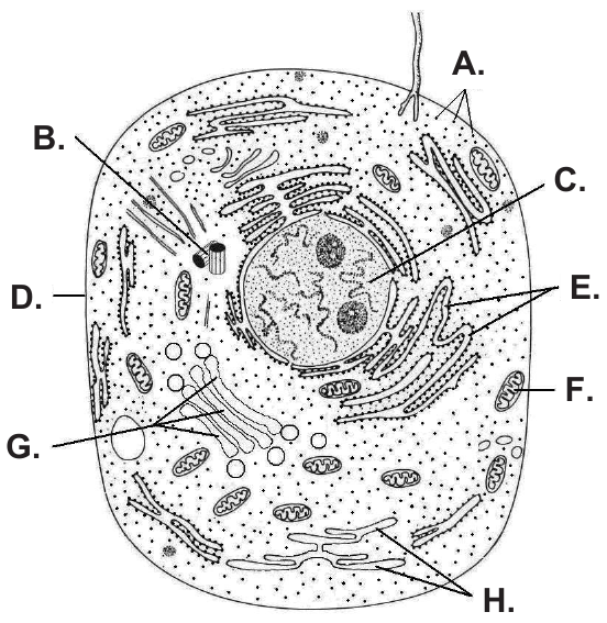 42.3. Pretpostavimo da slika prikazuje stanicu gušterače. Kako se naziva stanični organel na kojem će se sintetizirati inzulin, na slici označen slovom E?
