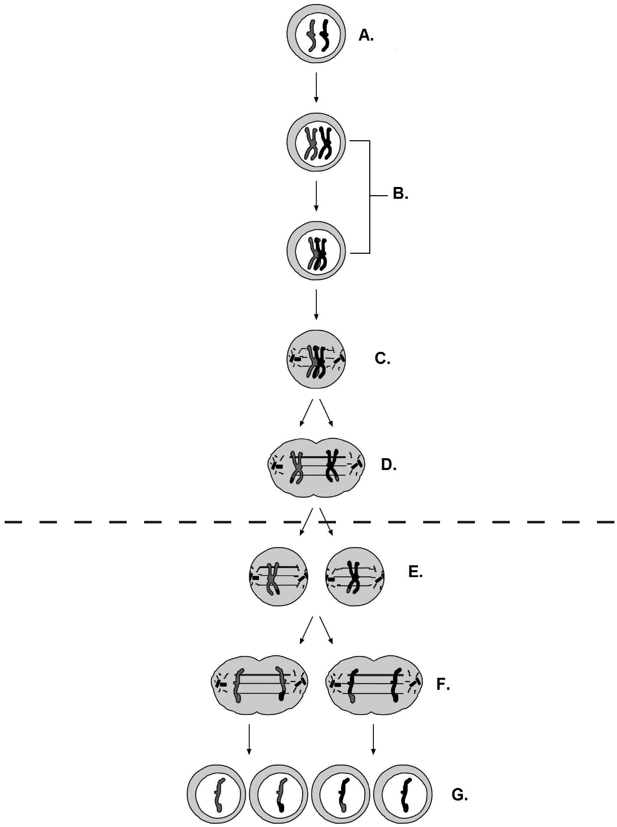 43.1. U kojoj fazi mejoze dolazi do razdvajanja homolognih kromosoma? Kojim je slovom ta faza označena na slici? Faza mejoze: Slovo kojim je označena na slici: