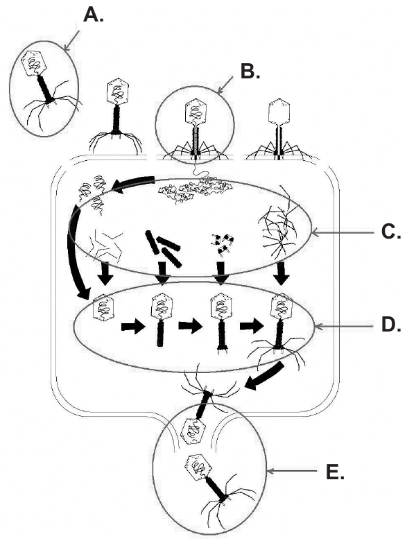 Slika prikazuje umnožavanje virusa u bakterijskoj stanici.